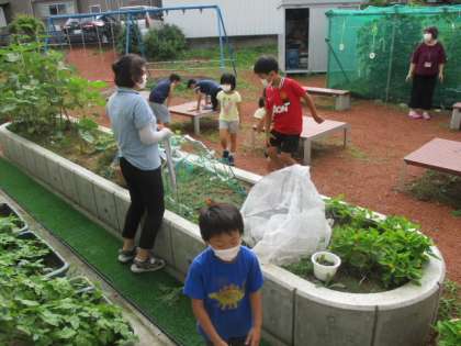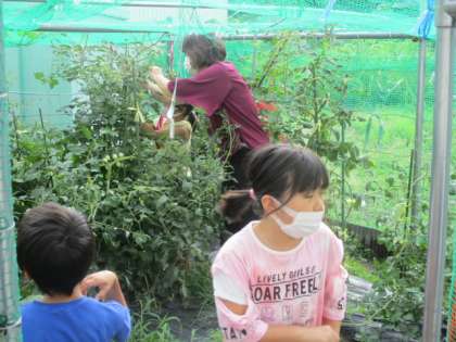 今朝、2年生の学級農園でまたまたサルの被害が発見されました。これで2度目です。写真でも分かる通り、この畑は厳重にネットを張った「サルセキュリティ」の高い畑だったはずですが、今回はネットの上部から侵入したようです。前回の反省のもと、取り付けたヘビの作り物は功を奏しなかったようです。残念!
