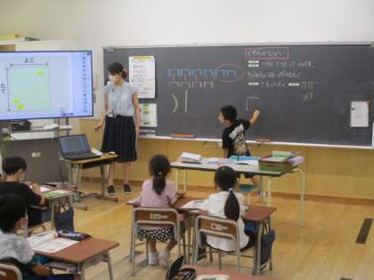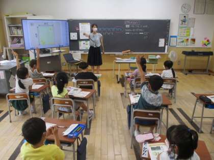 1年生の1時間目も算数の授業でした。今日の学習課題は「どちらがながい」で、紙を例に「たて」や「よこ」という意味も習いました。担任の先生からの質問に、元気よく手を挙げてみんなの前で答えていました。