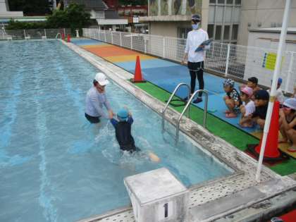 3時間目の1年生は、2年生と合同でプール学習でした。今日は大きいプールを使って泳力の測定をしました。先生から「壁をしっかり蹴って先生のところまで来ましょう!」の声に、がんばって泳いでいました。