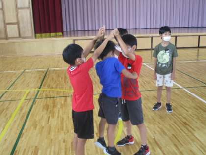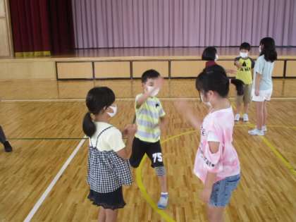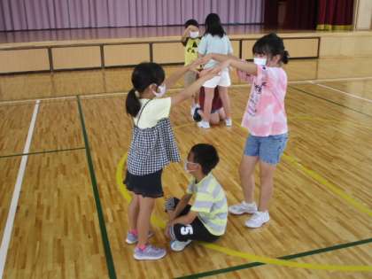 写真は「歌遊び」の様子です。3人でジャンケンをして「リスさん」とそのお家役に分かれます。動画にもその様子が映っています。