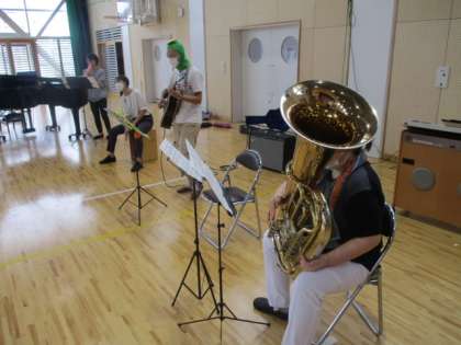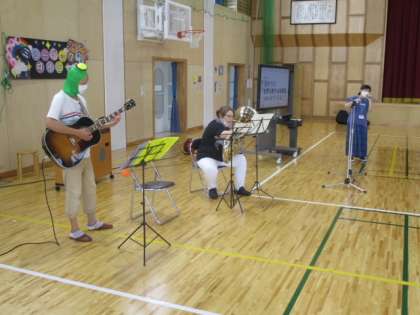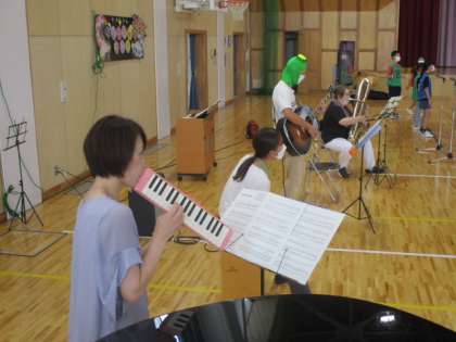 7月の歌「世界を旅する音楽室」をみんなで歌いますが、伴奏には先述の特別ゲストさんに加え、チューバの演奏が上手な本校の調理員さんにも加わってもらいました。