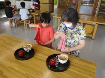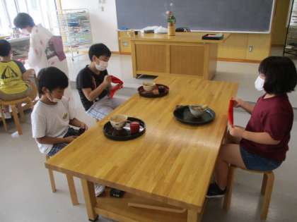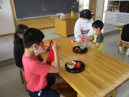 写真はお茶クラブです。講師の先生には、涼しげで素敵な浴衣姿で指導していただきました。そして、この学期中に教えていただいた内容の総復習として、一通りのお手前を復習していました。
