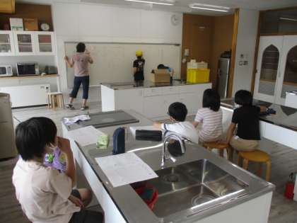 写真は手芸・工作クラブの様子です。みんなで話し合っているのは「みこし」の作成についてです。屋根はどんな形にするか、屋根の上には鳳凰と鯱を乗せるとか、相談しながら進めていきます。今日の後半には、実際の製作活動を始めました。