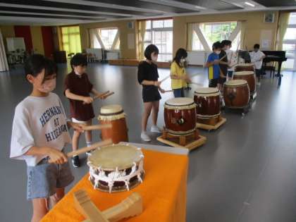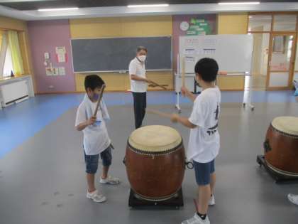 最後は和太鼓クラブです。これまで、みんなでリズムを揃えることもままならなかった状態でしたが、今日はかなり音が揃っていたようでした。講師の先生が次々と指示するリズムに合わせ、この児童も上手にたたいていました。