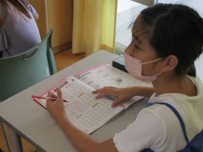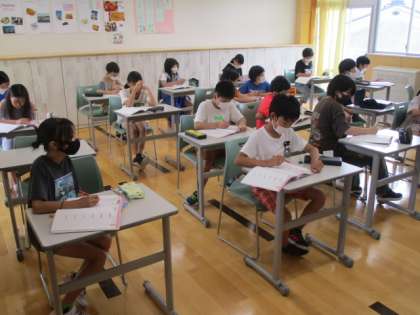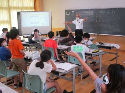 5年生の2時間目は外国語(英語)の時間でした。この授業で強化していくのはアルファベットです。先生から受け取ったビンゴの用紙に、アルファベットを9つ書いていきます。そして先生が操作している「アルファベット・ルーレット」で出てきたアルファベットをビンゴゲームのルールで塗りつぶしていきます。中には「もう少しで(9つ)全部塗りつぶせるところだった」という児童もいました。