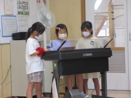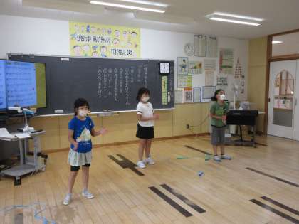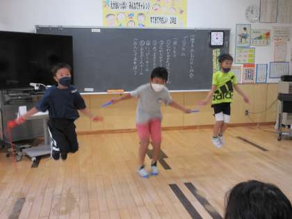 今日の4限に「1学期のお楽しみ会」を開きました。今回は、くじ引きでチームを決め、チームで出し物を考えて発表しました。縄跳び、縄跳び&ダンス、残念な生き物クイズ、ピアノとダンス、漢字クイズと5分間の持ち時間にできることをしました。練習時間が十分に取れなかったのですが、それぞれ考えて行っていました。5限は、みんなでゲームをする予定だったのですが、サルが畑に押し寄せてきて大騒ぎでした。