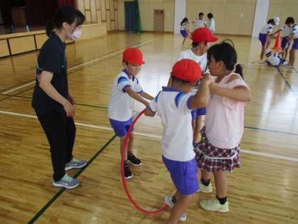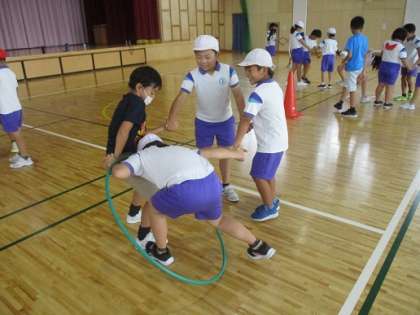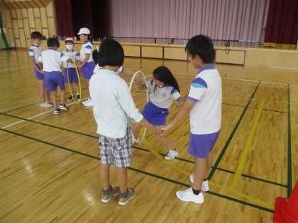 3・4年生は5時間目が合同体育でした。体育館をのぞいた時、4または5人のグループで「フラフープ抜け競争」をしていました。これはグループで手をつなぎ合い、手を離さずにフラフープを抜けていくというゲームです。フラフープを1周回すのは素早くできたグループでも、2周続けてとなるとどこかでひっかかっていたようです。