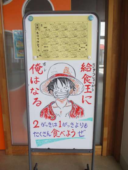 8月31日(水) ランチルーム前の看板 公開日 2022/08/31 更新日 2022/08/31 職員室から 2学期に入り、ランチルーム前にある給食献立用の看板のイラストが替わりました。今度はルフィーです。子どもたちも喜ぶと思います。