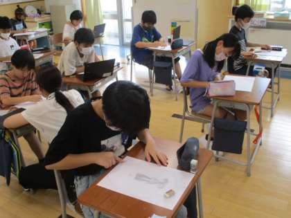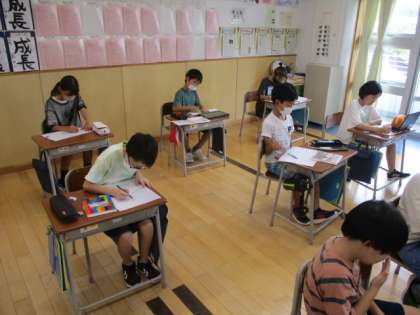 5時間目の5年生は図画工作の授業でした。「言葉から思いを広げて」という学習課題で、国語で習った「からたちの花」から感じたことを絵にしていきます。児童が描く作品を見ていると、それぞれの個性がよく理解できました。