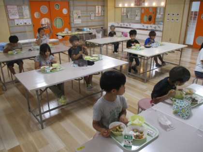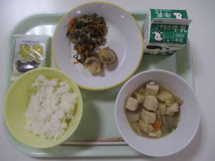 今日の給食献立は、ご飯、牛乳、ホタテの香味焼き、もずくのチャプチェ、ゴマけんちん、黒糖大豆 でした。