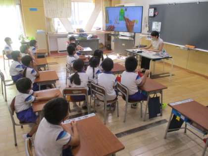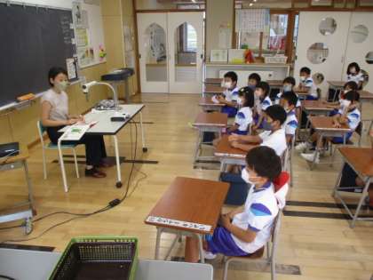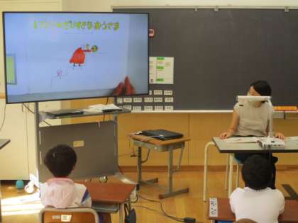1年生は「しりとりのだいすきなおうさま」という本でした。並んでいるものの名前が「しりとり」になっていて次が分かるものだから、ついつい言ってしまう児童もチラホラ見られました。