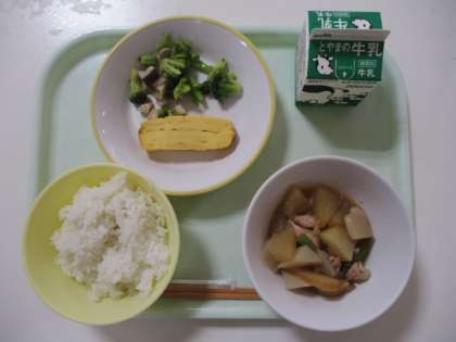 今日の給食献立は、ご飯、牛乳、厚焼き卵、ブロッコリーとエリンギのソテー、大根と鶏肉の煮込み でした。
