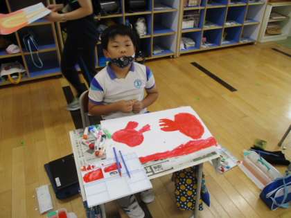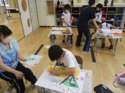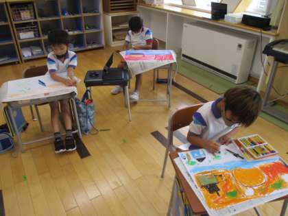 3年生の図画工作の授業風景です。学習課題を「『夕日がせなかをおしてくる』からイメージして絵をかこう」とし、同名の詩を読んで感じたことを絵にしていきます。児童の描いている作品を見ていると、やはり赤やオレンジの色使いが多かったようです。
