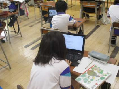 4年生の1時間目は国語の授業でした。学習課題を「いろいろな意味クイズをつくろう」として、いわゆる「同音異義語」についての学習を進めました。子供たち自身も、国語辞典やクロームブックを使って同音異義語を探し、クイズをつくっていました。
