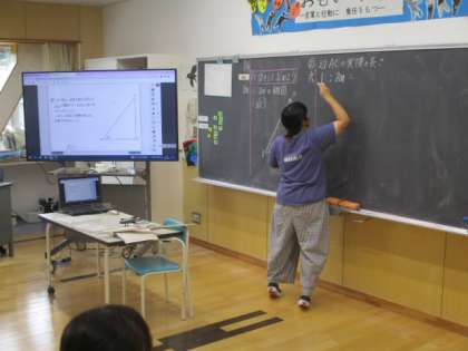6年生の1時間目は算数の授業でした。今学習している内容は、縮図を利用して実際の長さを求めるものです。以前に習った「比」の考えを使い、答えを求めます。その過程では、どことどこを比べ比をつくるのかがややこしいのですが、ゆっくり図を描くなどすることで関係性がはっきりと見えてきます。