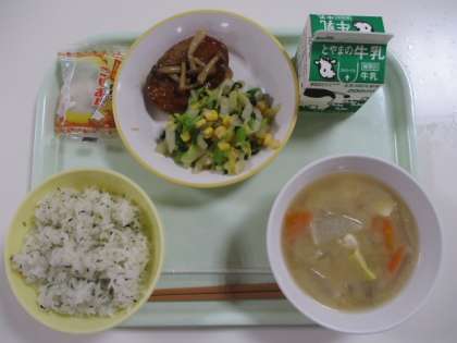 今日の給食献立は、菜めし、牛乳、ハンバーグのキノコソースかけ、コーン和え、さつま汁、月見大福 でした。