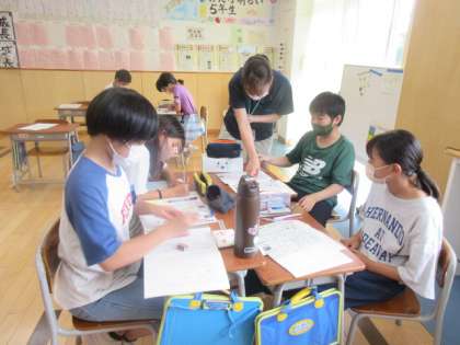 5年生は、同じニュースを扱った2社の新聞記事を読み比べ、違いや共通点を見つけていました。グループで、どの子供も気づいたことを発言し、互いに聞き合う姿勢が育っています。各グループが比較する記事はすべて違っていました。互いのグループの気づきを聞くことも興味深いと思います。
