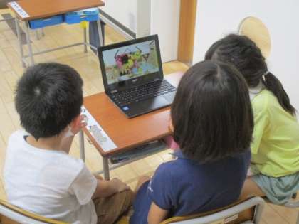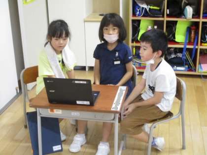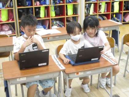 チャレンジタイム(給食後の35分間)に1年生教室をのぞくと、クロームブックを開いている児童が結構いました。何をしているのか見てみると、動画による学習教材を見ているところでした。