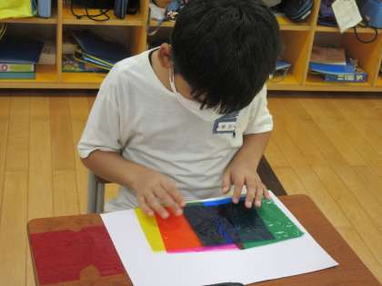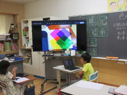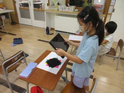 図工の時間に「色の見え方無限大」という学習をしました。赤、青、黄、緑の4色のセロハンを重ねたり、ずらしたりして、できる色や形を楽しみました。できた色や形をクロームブックで写真を撮りました。その後、一人ずつ発表しました。子供たちは、きれいな色や形を見付けていました。