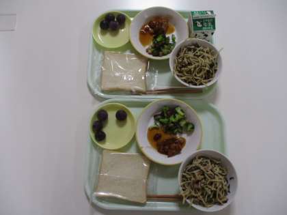 今日の給食献立は、食パン、牛乳、照り焼きチキン、ビーンズサラダ、ベーコンとひじきの和風スパゲッティ、巨峰 でした。
