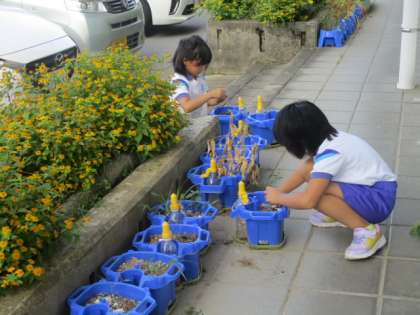 今朝は2年生が2人、学級花壇の横で鉢植えの世話をしていました。何か育てているのでしょうか。
