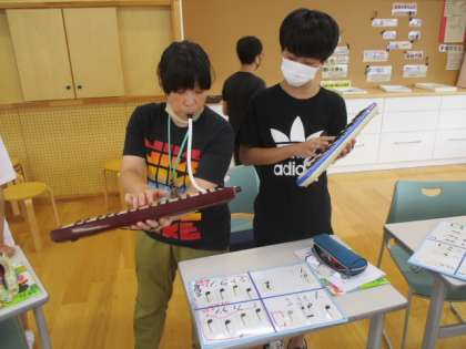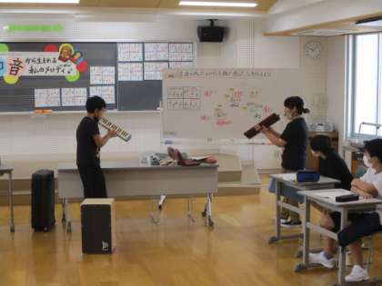 授業の前半には、常時活動として取り組んでいるトーンチャイムの演奏(動画あり)を行いました。また、他の人が作ったメロディを聴き、互いにその感想を交換しました。そして最後には、また新たなメロディづくりを行いました。