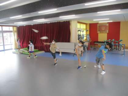 写真上 : 5年生は紙飛行機の競技会