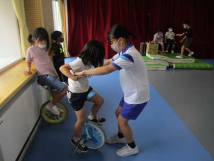 下 : お姉さんに手伝ってもらって一輪車