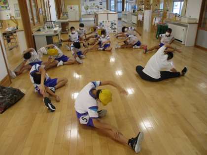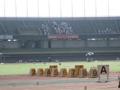 朝、全員が集合してから教室前で準備運動をしました。その後、行政センターまで移動し、バスに乗り込みました。陸上競技場では、メインスタンド向かい側に陣取りました。