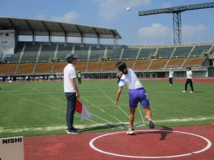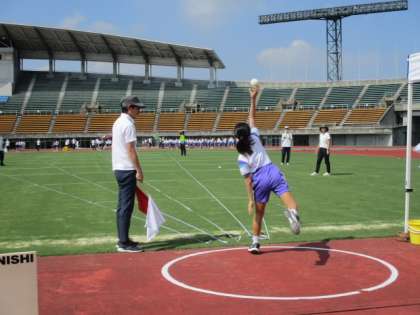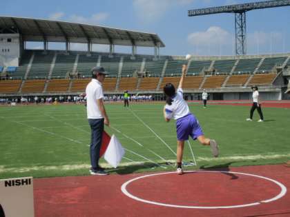 女子のソフトボール投げを観戦に行きました。それぞれ2投することができ、良い方の記録が採用されます。