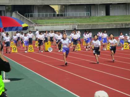女子50m走で順番待ちをしている様子です。2枚目の写真は1発勝負の本番の様子です。多いグループで8人が同時に走ります。