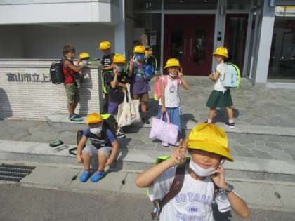 1年生は5時間目がなく下校ですので、他の学年より一足早く3連休に入りました。写真は、チャレンジクラブへ行く時の様子です。9月も中旬ですが、玄関先は本当に暑かったです。