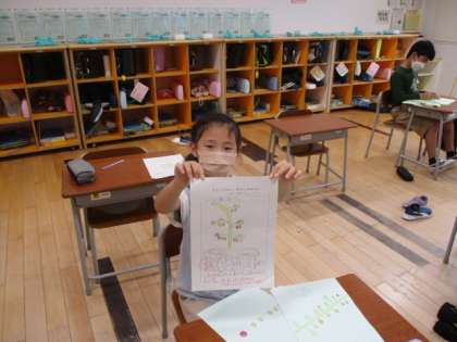 2時間目の2年生は、生活科の授業で「やさい日き」づくりをしました。この日記には、しっかりと表紙や裏表紙をつけ、中のページも色を塗ってきれいに仕上げていました。ナスの紫や、ミニトマトの赤など色鮮やかでした。