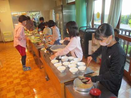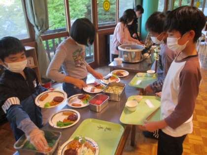 入所式を終えた子供たちは、いよいよお待ちかねの夕食をいただきます。配膳は学校毎に行いますが、毎日の給食で慣れているので問題なしです。ハンバーグに春巻き、ポテトサラダ等々、激励に訪れた私には食べる分がありませんので、お腹が「グーッ」となってしまいそうです。