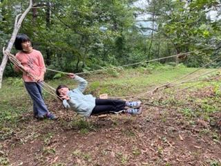 写真上:ロープを縛って作り上げたハンモック、完成です。