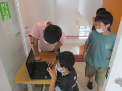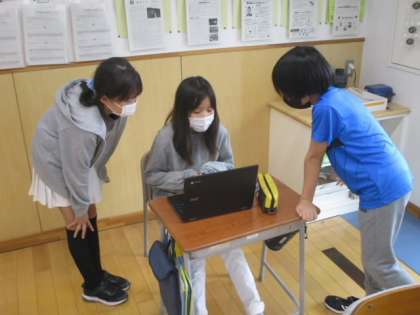 4時間目の5年生は学級活動の時間でした。この時間にはそれぞれの係で集まり、クロームブックを使って掲示物を作成中でした。