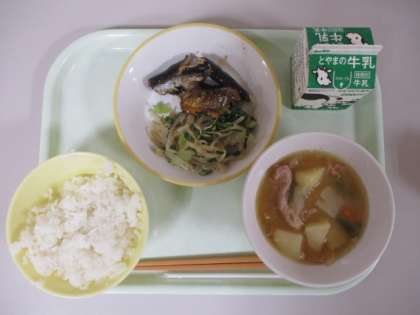 今日の給食献立は、ご飯、牛乳、いわしの土佐煮、ごま和え、豚肉とジャガイモの南蛮煮 でした。