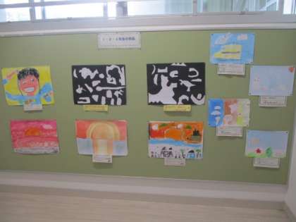 階段の踊り場に下学年の作品が展示されています。近々学習参観がありますが、その際には是非ご覧ください。