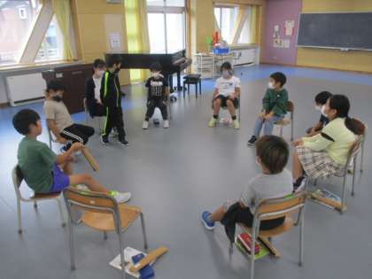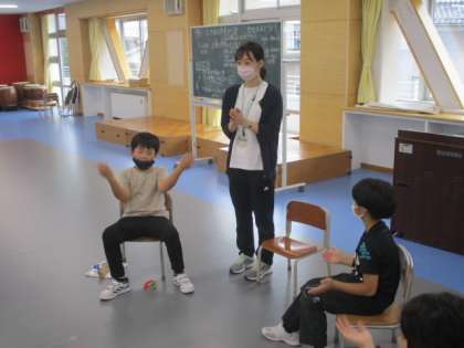 5時間目の3年生は、みんなの広場で音楽の授業でした。授業を見学したのは最初の部分でしたが、みんなで手をたたきながら「リズムリレー」をしていました。