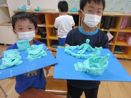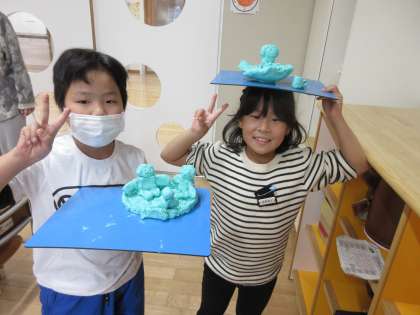昨日の図工の時間に、ねん土を使って「夏休みの思い出」を形に表しました。温泉に入ってる様子やキャンプをした思い出をねん土でつくっていました。夏休みの楽しかった思い出を友達と話しながらつくっていました。