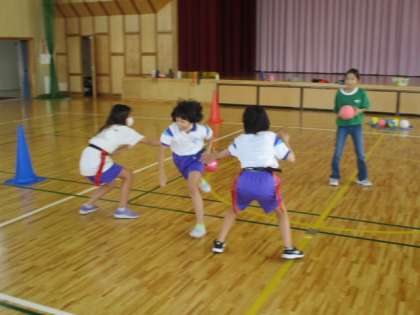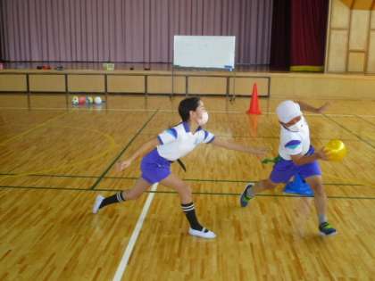 3時間目の5年生は体育の授業でした。今回も前回に引き続き「フラッグフットボール」のゲームをしました。今日の授業では途中に話し合いの機会をもち、2つの「鬼ゾーン」に守りをどのように配置するかを検討しました。その結果、後のゲームでは「3と2」に分けたチームが「2と3」に分けたチームに負けたそうです。