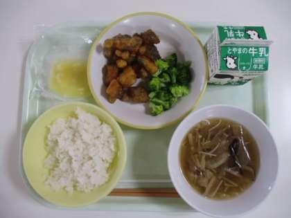 今日の給食献立は、ご飯、牛乳、魚とひよこ豆の甘からめ、茹でブロッコリー、さわに椀、冷凍リンゴ でした。