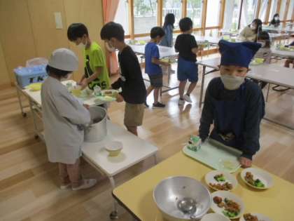 2枚目の写真と3枚目の写真は、それぞれ2年生と1年生が給食準備をしているところです。いつも準備が早い2年生ですので、これまでに準備の写真が撮れていなかったのですが、今回は撮影に成功しました。
