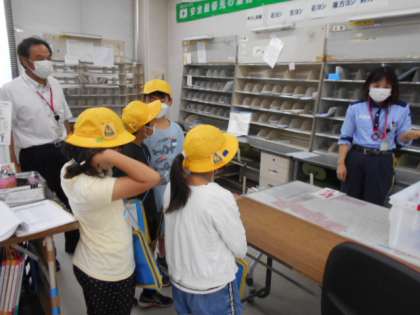 郵便局グループは、郵便物の仕分けの様子、郵便物が運ばれてきたときの仕事の様子等を見せてもらいました。普段入ることができない場所にも入れて頂き、自分たちのはがきや手紙が、どのように相手の家に届くのかが少し理解できたと感じました。