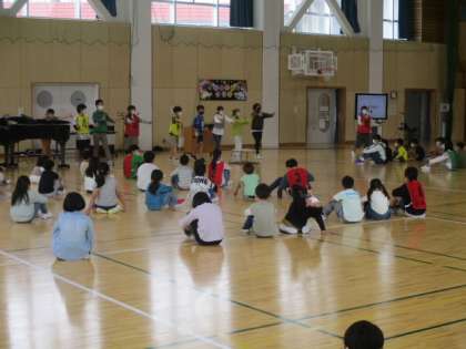 今朝のミュージックタイムも終わりです。退場も「上だきっ子ソング」に合わせ、1年生から順に教室へ戻ります。