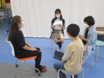 写真は、午前中のゲストティーチャーの方々にインタビューをしているところです。「小学生の時の夢は何ですか?」という質問もあったそうです。