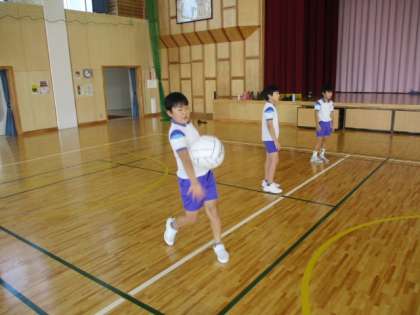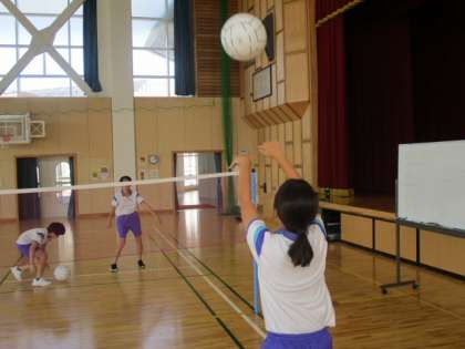 5時間目の6年生は体育でした。今日から取り組み始めたのは(ソフト)バレーボールです。みんなでネットを張り終える頃になると、何だかその気になってきまいた。この時間の練習はサーブから始めましたが、意外に上手にできたためレシーブとパスの練習に進みました。