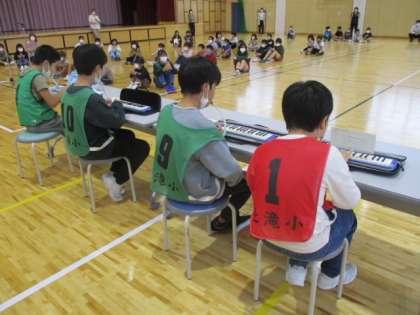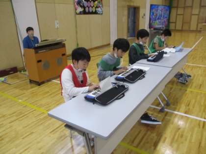 「上滝ショータイム」の有志2組目は、6年生の4人組です。これまた担任の先生の刻むリズムに合わせ、鍵盤ハーモニカの演奏を披露してくれました。