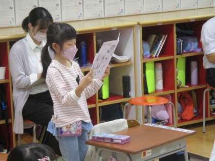 どの児童も自分の意見を紙にまとめています。そして担任は、その考えを予め把握していて添削も加えています。発表する子どもたちにとっては、この紙が大きな助けになっています。また、みんなの前で発表することは、大人でもハードルが高いことだと思います。困っている姿が見えた時、担任のフォローがあると自信をもって発表ができるようになります。