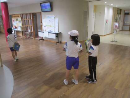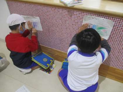 2時間目の1年生は図画工作の授業でした。今日は「でこぼこ はっけん!」という学習で、教室を飛び出し校内にある「でこぼこ」を探しに行きました。3枚目の写真は、壁の「でこぼこ」に紙をあてその上から色鉛筆でなぞり、写し取っているところです。